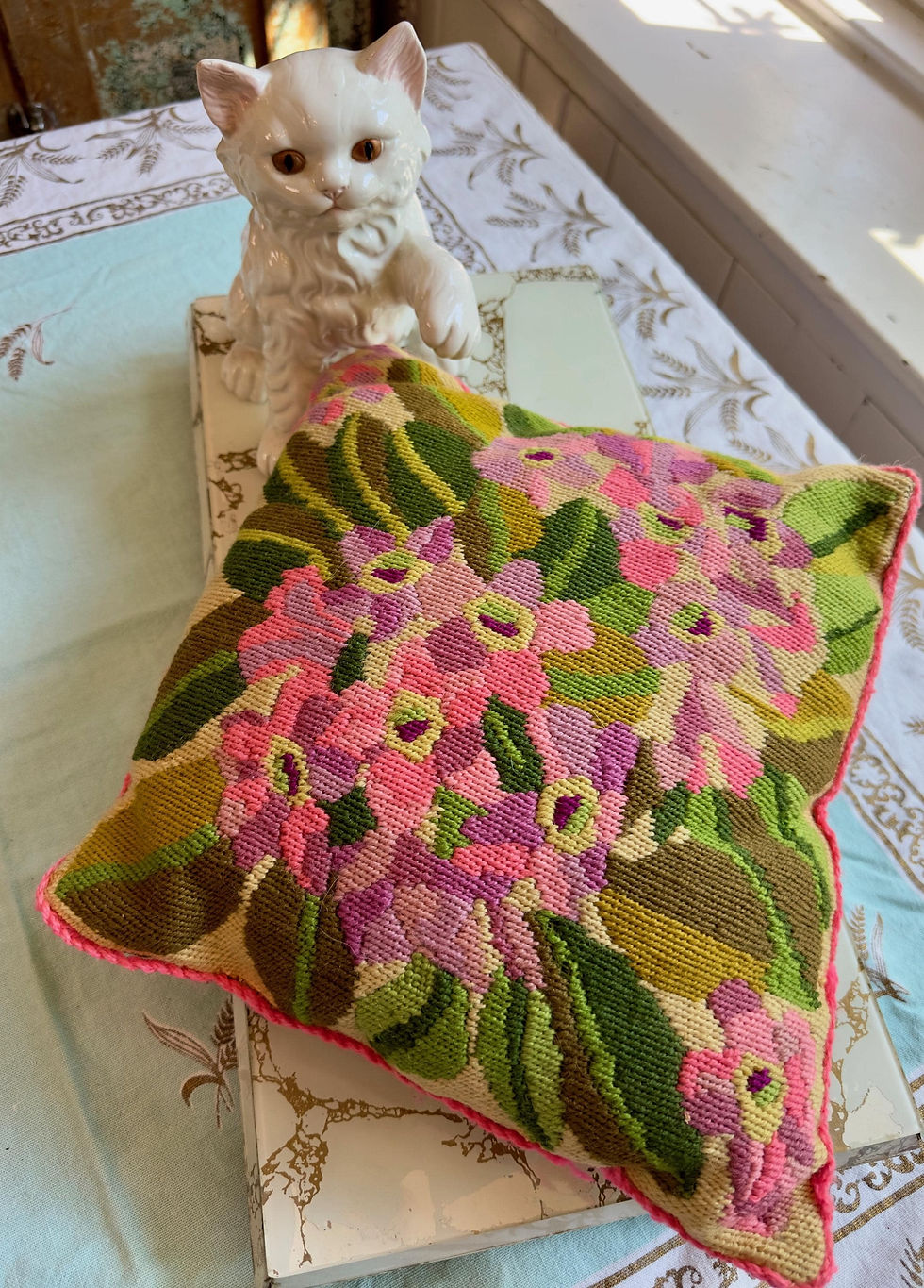 Vintage Needlepoint Floral pillow, Decorative Throw Pillow, Purple Violets, Pink