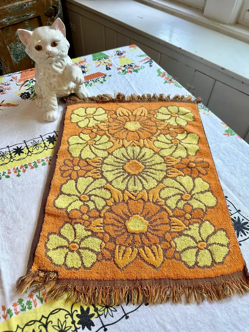 Vintage Orange & Yellow Hand Towel, Hippie Flowers, 1960s-1970s Flower