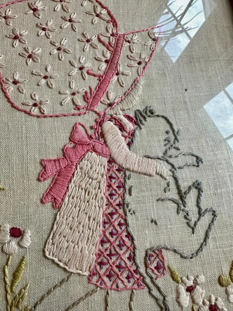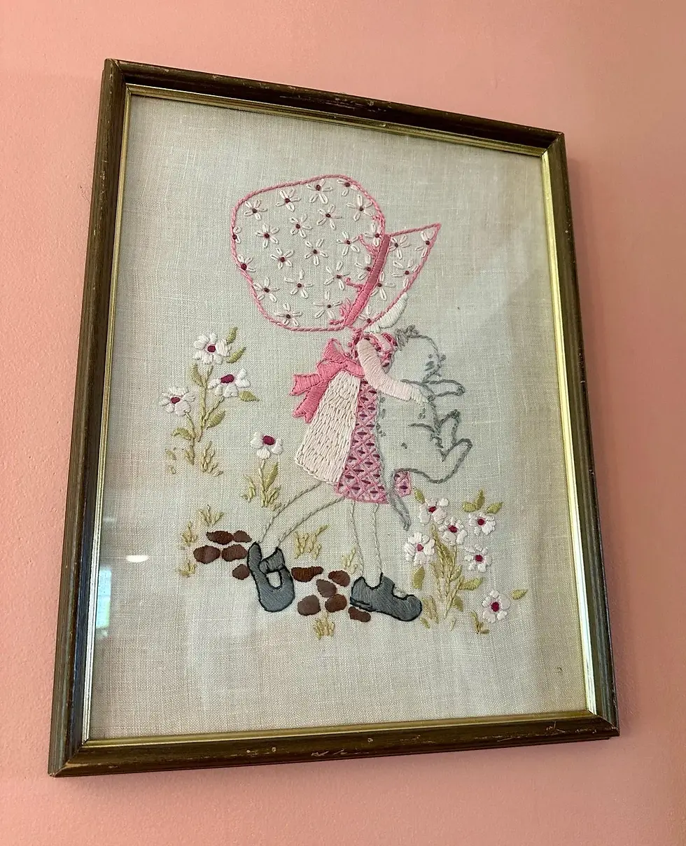 Vintage Embroidery, Holly Hobbie with Cat, Cute Little Girl, Prairie Dress, 1974