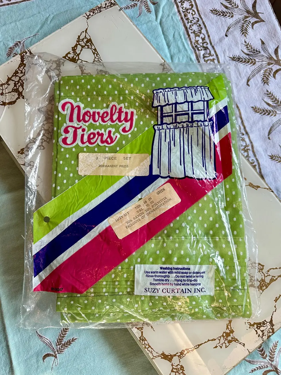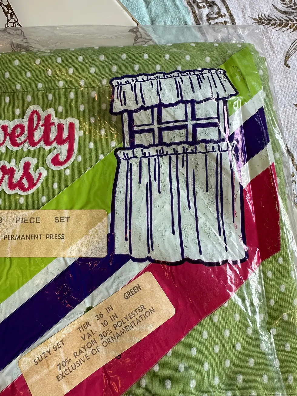 Vintage 1970s/1980s Sheer Green and White polka dot Curtains, Cafe Length